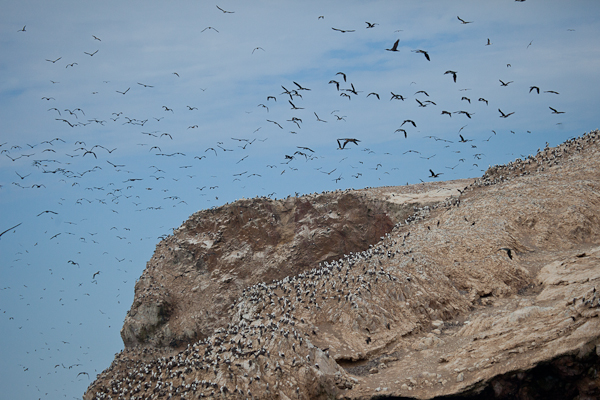 As we continued to circle the islands, Rick and I felt churning in our stomachs. The rocking boat combined with the overwhelming smell of guano made the ride less than pleasant. Image stabilization on the camera didn’t help – as the image inside the viewfinder shifted slightly each time I focused.