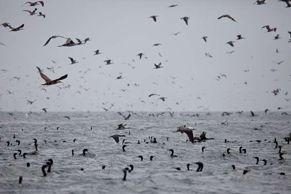 We circled the islands for another 20 minutes and returned to the open water, relieved by the fresh wind. On the way out we passed an enormous flock of cormorants and other seabirds flying over the water. We kept pace with them as the swooped and dove.