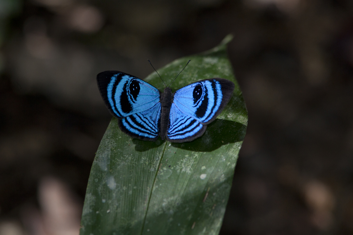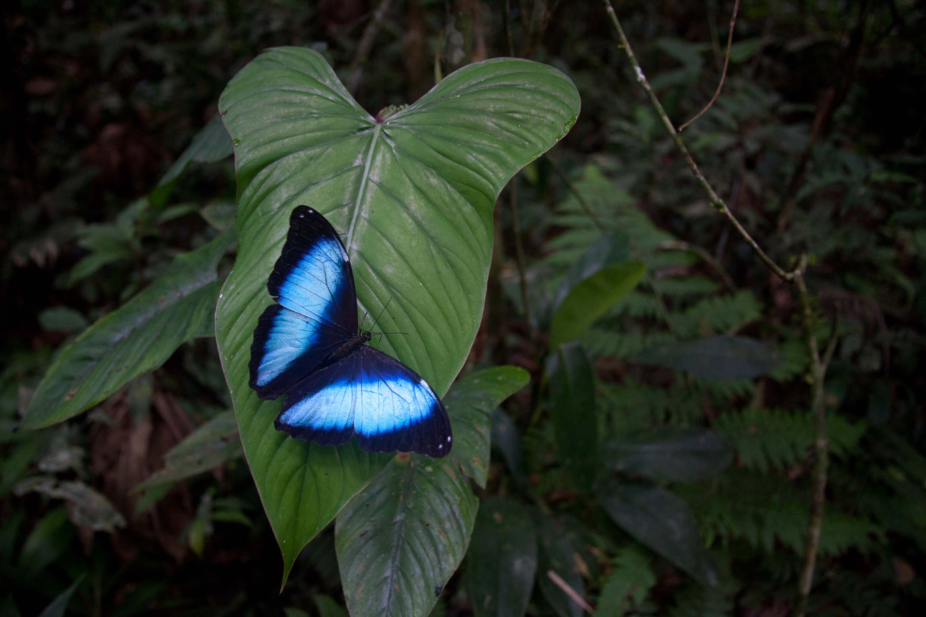 We took a few fun photos of the butterfly on our clothes and then Rick got creative – he placed it on my nose. The image above is our favorite from the series because it shows just how big the morpho was. We tried to let the butterfly go after that, but he just kept following us. Rick decided to take the opportunity to photograph it in a natural setting because they rarely sit with their wings open. After a few tries, we were almost ready to give up because the morpho was much more interested in our skin than the leaf. Then, I had an idea. I took some sweat from my face (yes, there was a lot of sweat) and rubbed it on the leaf where Rick wanted the morpho to sit. Amazingly, it worked! The image below is the result of that experiment. It was a really magical hour in the jungle with a beautiful creature and one of my favorite memories from Peru.