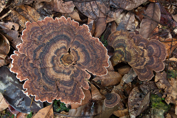 It turns out there is only one trail here and it is about 3 kilometers long. Otherwise, we are blocked in by a river on one side and dense forest everywhere else. We started out on the trail and had a magical experienced within the first 500 meters. As I was photographing a patch of mushrooms, Rick noticed that a blue morpho butterfly was hanging around. It is pretty common to see a morpho in the forest – a flash of iridescent blue gliding down the trail and disappearing into the landscape just after you score a fleeting glimpse. However, this morpho was circling us and coming closer and closer. After a few minutes, Rick called out to me when he found the morpho on his shirt and then on his cheek. Our clothes were soaked with sweat from the boat ride in the hot sun and the butterfly was clearly attracted to the salt covering our skin.