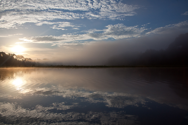 We got up at 4:00am for breakfast at 4:30am. Our boat left for the oxbow lake at 5 sharp. We hiked for 30 minutes to get to the lake and then climbed on a catamaran. By the time we got out on the lake, the sun was just rising through the mist. It was spectacular. We drifted about and saw a donacobius and a bat falcon.