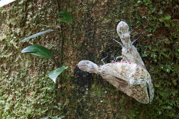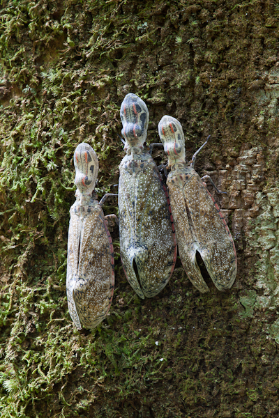While sometimes a nuisance, the insects are also the most enchanting part of the forest. At night, when I rise from my tent, moths hover in the hundreds above the campsite, glittering like fairies in the faint light of my headlamp. Today, I hiked a new trail the men are clearing. As I reached the top of a hill, I heard “Gabrielea, ven ven!” I saw Freddy waving his machete for me to come. He led me through the trail to a clearing and pointed at a large tree. From a distance I thought the insects on the side where large cicadas. Then, it slowly dawned on me – they were fulgorids – an insect I have wanted to see in the wild since I was 7 or 8 years old. These fantastic creatures have large wings and a head shaped like an unshelled peanut. There were 8 individuals on the tree and the largest ones were almost 7 inches long. Amazingly, they ranged in color from pastel yellow to pastel blue. While I found it difficult to take creative images of them, I did get a few interesting pictures. Then, I put my camera aside and just looked. Their underwings had yellow and black eyespots. Despite my prodding, I could not get one to fly, but I did see a mating pair. I was thrilled!