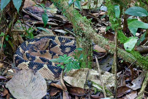 After that, I wandered through the forest until Freddy appeared once more. This time, it was a bushmaster. The bushmaster is the most venomous snake in this area – I have had many a nightmare about it. However, this would be my first time seeing one in the wild and I was incredibly excited. This individual was about 2 meters long and it was sleeping under a tree in the leaf litter. Until it was pointed out to me, I would have had trouble seeing it. Its coloration makes it blend in perfectly with its surroundings. When I did see it, I was immediately impressed by how vicious it looks. Its whole appearance, from the sharp scales to the angular head, screams “I am a mean devil of a snake.” I took a lot of photos – from a distance. After I finished and started packing my camera up, the men began to move in with machetes. I quickly realized that they were going to kill it. I could not stand the thought of such a beautiful animal, however dangerous, being killed. So, I began to put up a fight.