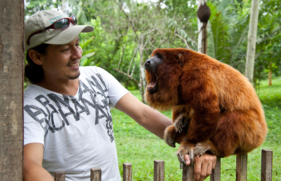 We arrived at Amazon Shelter this morning and were greeted by a red howler monkey named Pepe. He ran up to us much like a happy dog and led us to the lodge. Amazon Shelter is run by a woman named Magali – she has a rehabilitation center, a lodge, and a beautiful piece of forest. She moved to the Puerto Maldonado area from Lima about four years ago to start the shelter and now has over 20 animals to care for. The animals range from a koati to macaws to a red brocket deer. And they could not ask for a more loving and caring guardian.