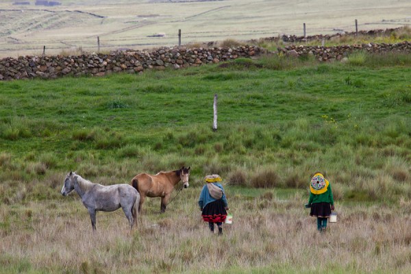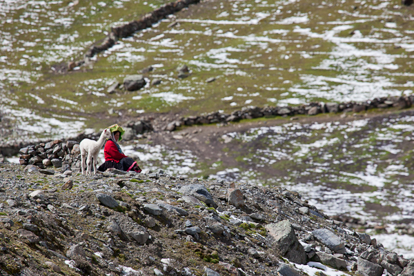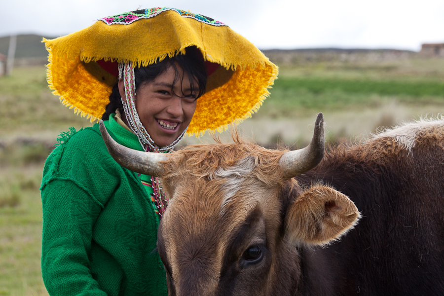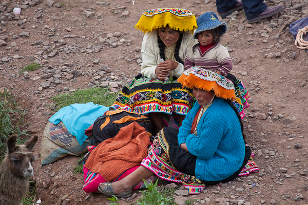 This morning I couldn’t get out of bed – the cozy wool blankets and the space heater made the ascent all the more difficult. I finally got up and ventured to the eating area where I had breakfast with Rick and the staff. We ate quickly and gathered up our things for the day. Our first stop was Upis, a small Andean community of around 130 people. As we drove towards the community, I was overwhelmed by the beauty of the surroundings – in some ways it reminds me of Ireland – stone fences, green pastures, and rolling hills. In other ways, it is a foreign landscape – when the clouds open up you are surrounded by snow-capped peaks on all sides. The women and men here look like colorful birds – all decked out in neon colors and sequins. In Cusco I have often seen people in traditional dress and wondered if they were dressing up the traditional costume. They are not. Up here, with no one to see but the neighbors, the women are attired in the most splendid patterns and colors from head to foot. The men also wear colorful clothing, some only hats and others in full regalia – ponchos, hats, and wraps.